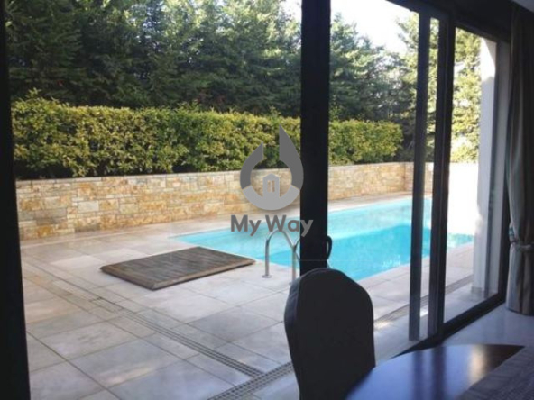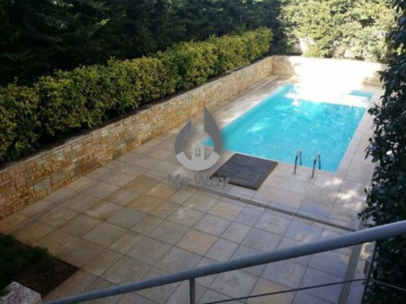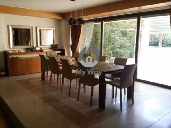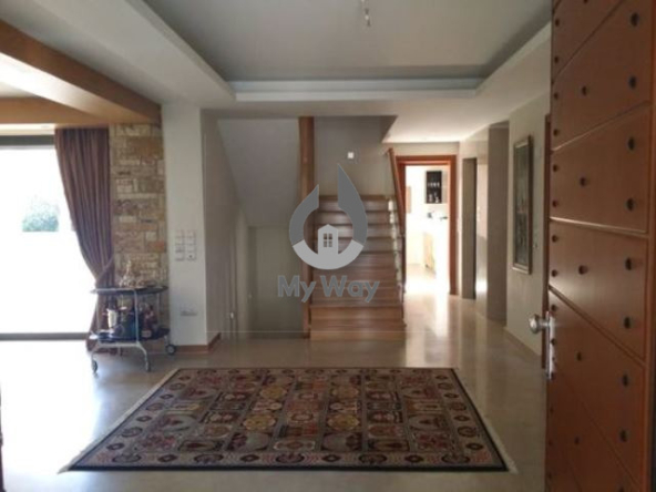 Στο υπερυψωμένο ισόγειο βρίσκεται άνετο καθιστικό με τζάκι και έξοδο σε μεγάλες βεράντες, χωριστή τραπεζαρία, χώρος γραφείου με τζάκι, κουζίνα πλήρως εξοπλισμένη με όλες τις συσκευές και καθημερινό καθιστικό – τραπεζαρία, WC επισκεπτών και βεστιάριο.